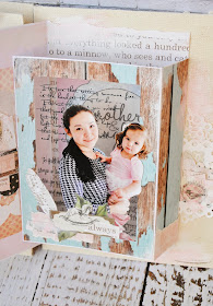Вырезанная фотография, интегрированная в импровизированный пейзаж - цветы, облака, парящие в воздухе сердца и веточки. Здесь я снова использовала оверлей с очень милым текстом - который звучит как напутствие дочери в будущем - look for a guy who will accept you.. Лист пленки прилегает неплотно и чиповую бабочку я подклеила снизу, таким образом она как будто порхает в воздухе.